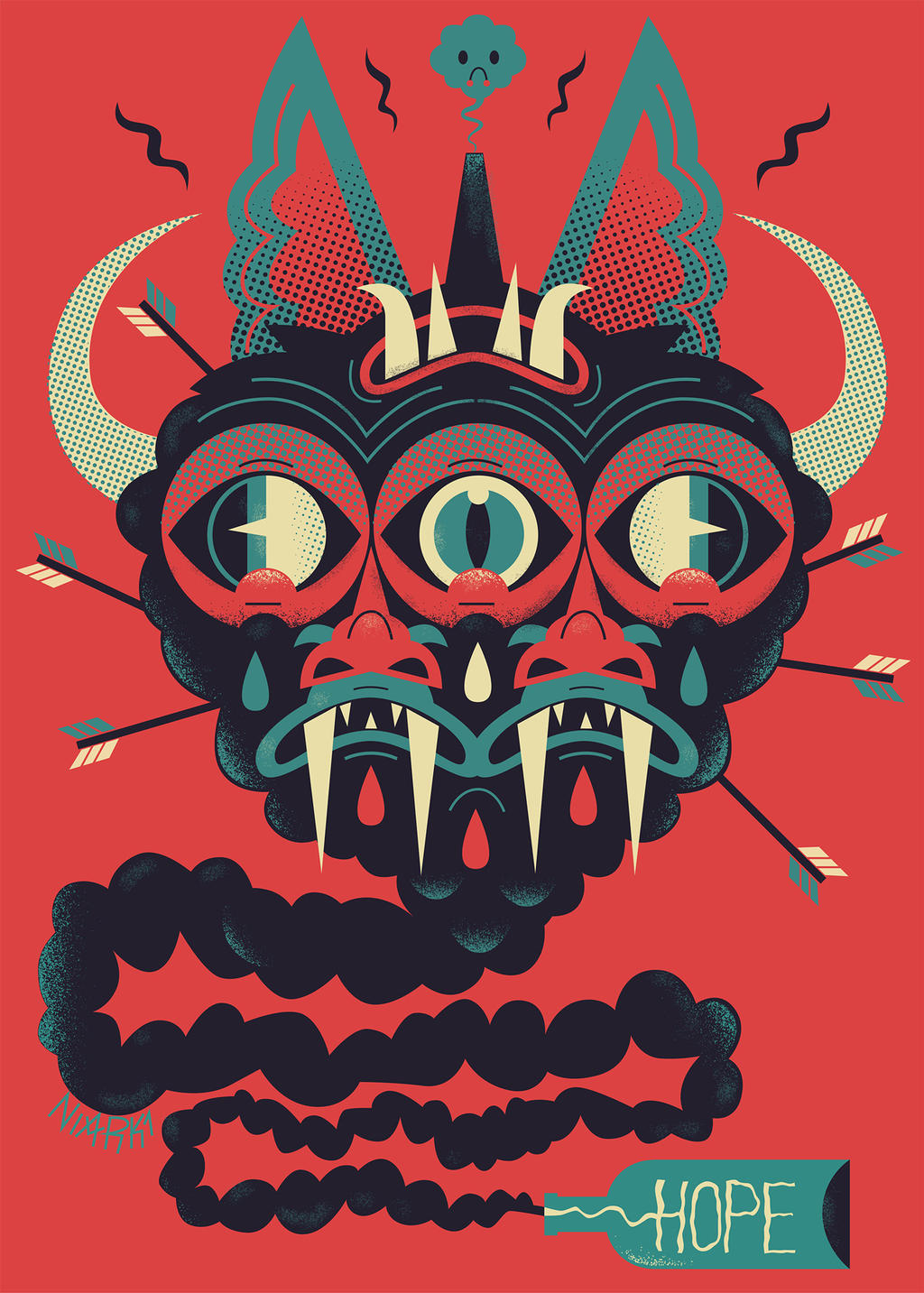 Usually I have breakfast with my young kid and bring him to school. Back home I check my E-Mails and stupid stuff on the internet. Then I open illustrator and photoshop softs, trying to produce some stuff. If I’m not too busy on digital artworks I go to my studio to paint and draw.