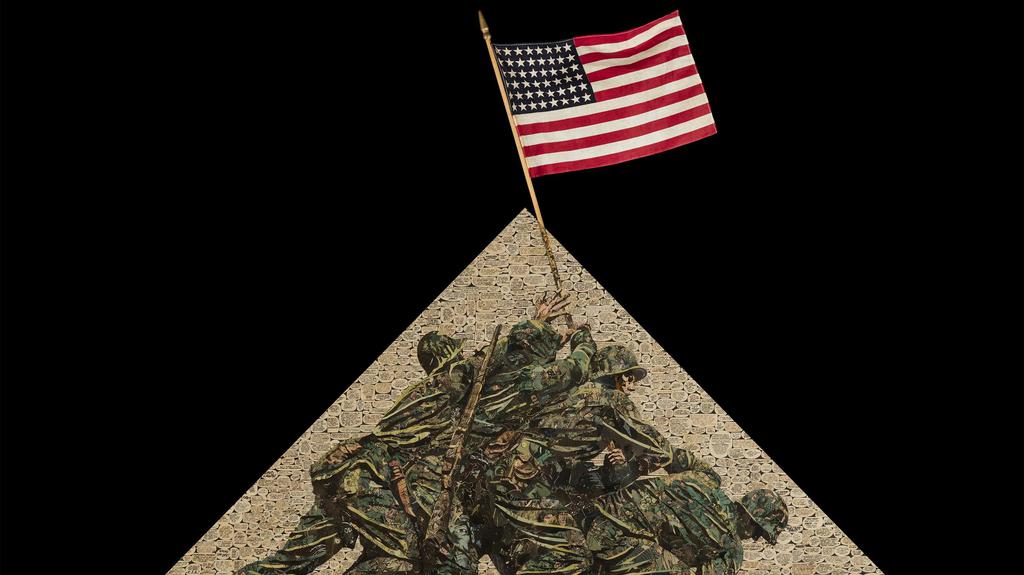 Meticulously cut-out and collaged images of propaganda, soldiers, and scenes of war are constructed from vintage U.S. comic books (pictured). A trilogy of portraits remark upon the country’s global combat history and entrenched war culture, and in ‘The Return Of The Living Dead’, used M-65 field jackets and authentic memorial funeral flags act as a statement of the horror and trauma of coming home to face an even greater fight, whether from Pearl Harbour, Vietnam or Afghanistan.