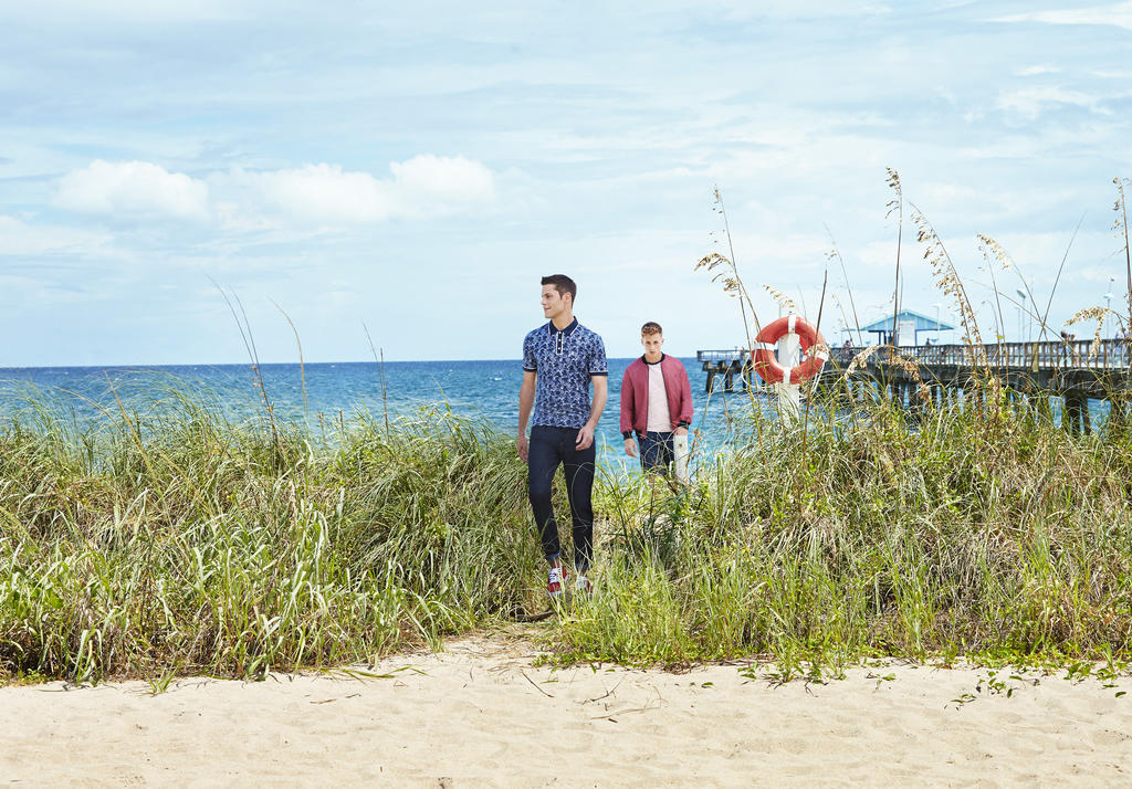 For Spring 2015, Original Penguin took its inspiration from the energetic and glamorous Magic City itself: late 50s Miami Beach. Driving down iconic Ocean Drive in South Beach, a bright motel sign flashing neon pink alongside a lone palm tree is emblematic of this season’s collection. The colour palette blends chromatic reds and vibrant greens with a splash of aqua and soft pinks, providing a contrast reminiscent of the saturated colours of beachfront homes, set against the soft pastel colours of Miami Beach’s art-deco streets. Foliage prints taken straight from the rows of breezy palms round out this springtime escape.