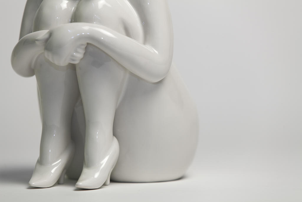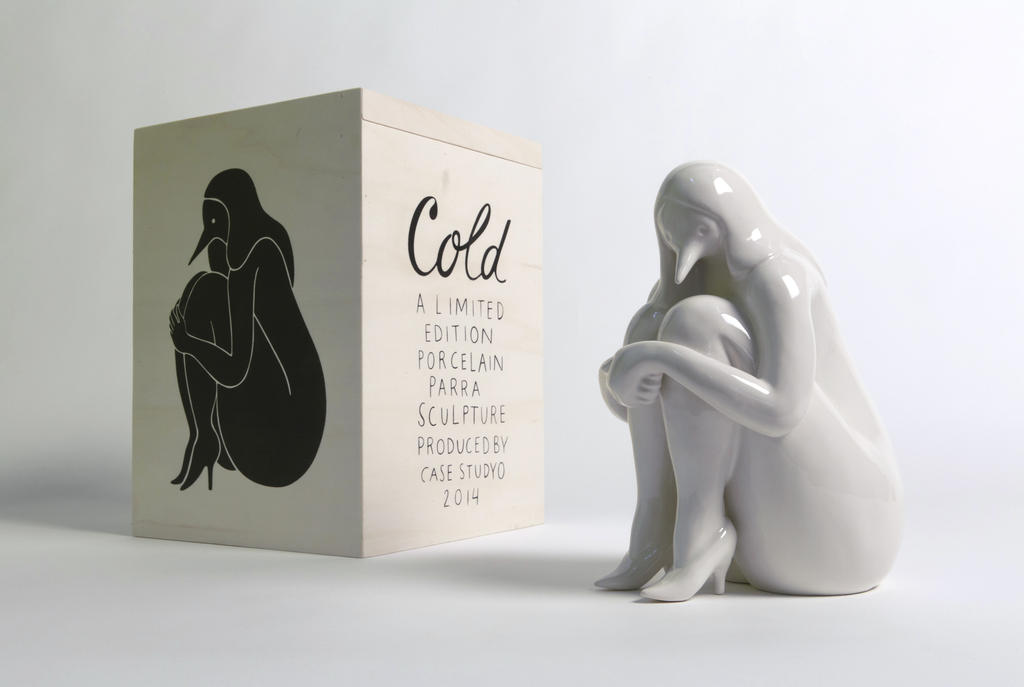 It's a new sculpture called “Cold” - a surreal and hybrid character of a female birdlike creature with hands around the legs looking for warmth. This beautiful and tiny creature really shows an evolution in Parra’s work. Putting colors aside, the artist once again translates his unique curves post-pop imagery into a beautiful porcelain sculpture.