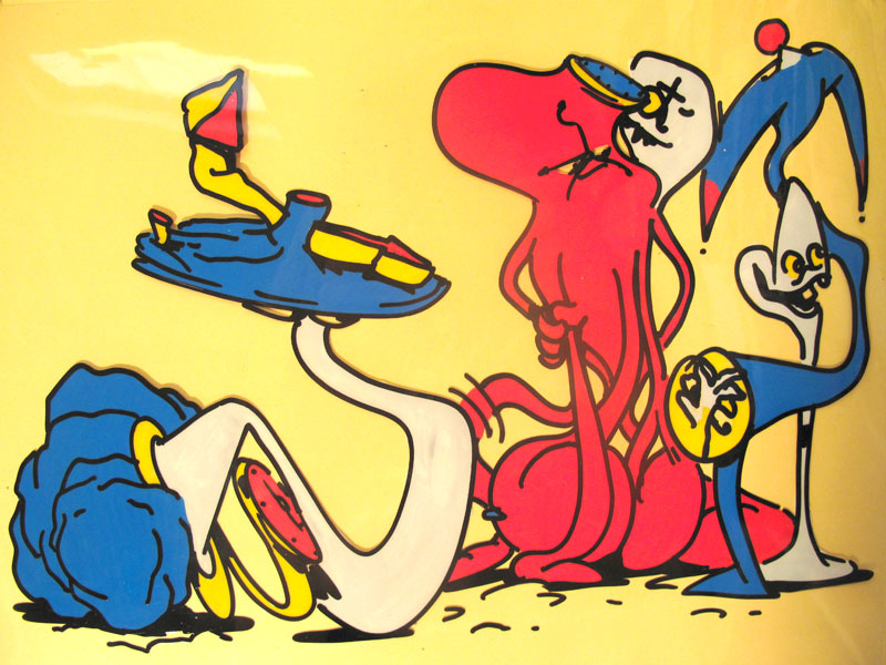 Using cels (transparent sheets) originally employed to split up the production process of hand-drawn animation, Maurice and Horfée revive a historical technique of cartoon creation to seamlessly layer up their compositions. For Maurice, this results in uncanny scenes of abandoned castles interrupted by ambling hobo characters, and obscure scenarios of mystical objects, ‘freed', as James Boaden has said, 'from the shackles of narrative to run amok’.