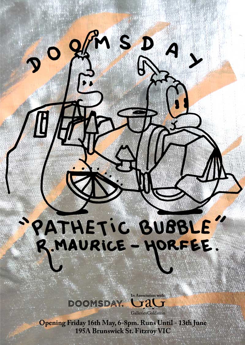 Yet metamorphosis is not only a matter of characterization. Just as Horfée moves beyond the boundaries of graf art, Maurice melts the margins of the comic-book frame, turning figures of flat surfaces into solid objects in space. His suggestively “sculptural” approach to the cartoon, that debunks its status as a sub art, resonates with the subversive nature of Horfée’s entire practice – one that encourages you to read between the lines to understand what’s being said in the Pathetic Bubble.