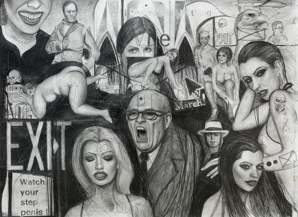 The metal connotation also expresses itself in the way the subjects all relate to one another. A screaming Rudy Giuliani with spades tattooed on his forehead, or a full-breasted Ronald Reagan posing erotically, exemplify the unnatural realism in the paintings. These radical beasts, boasted in religious connotation and macabre imagery, seem to want to be let loose by a barrage of thunderous sound that only heavy metal can grant.
