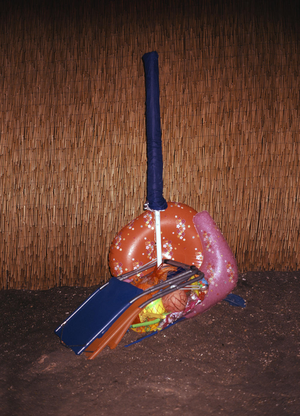At the beginning of summer vacation tourists save their spot at the beach of Terracina. Marked with a sunshade. The site is claimed during vacation and meeting point for the entire family. Every evening they arrange and fix their numerous beach stuff around the sunshade. Secured for the night.