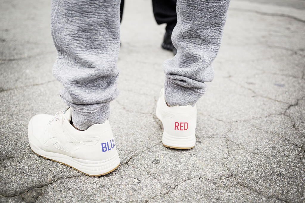 Kendrick is now in the shoebiz. This is the first one of his collection, and he dives right in with a statement about uniting crips and bloods. The creamy white is a call for neutrality.