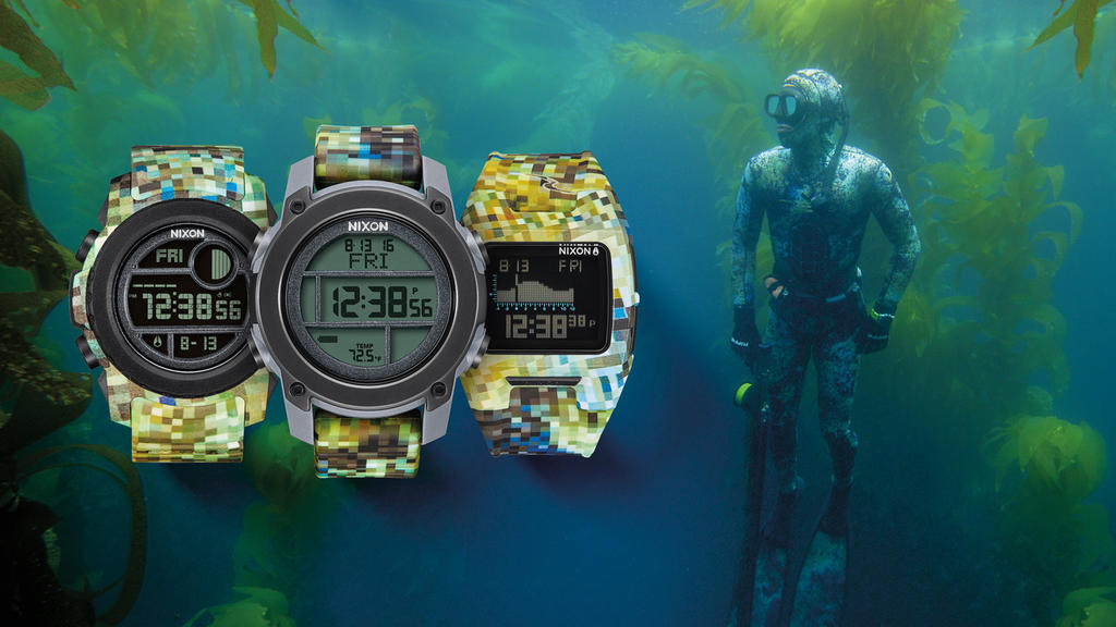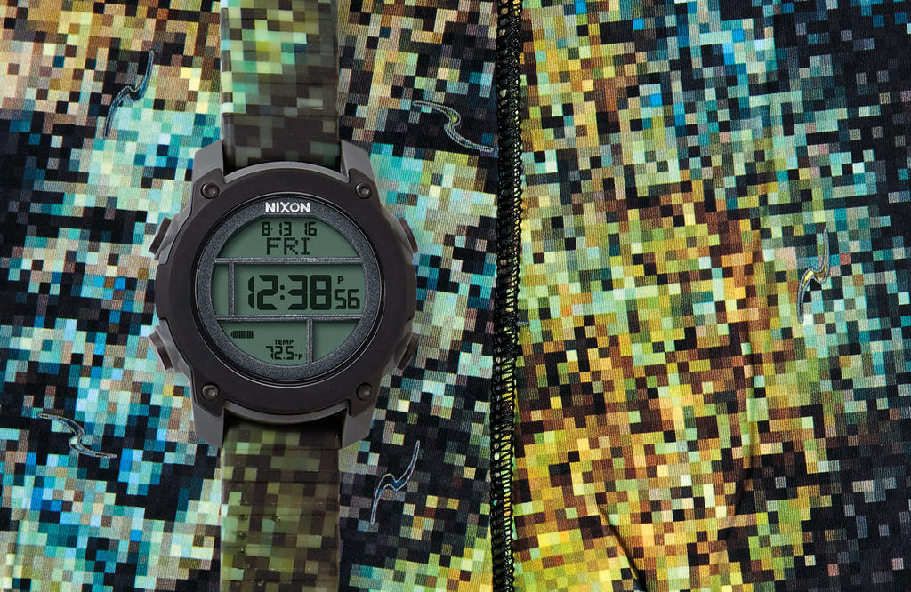 The collaborative capsule introduces a first-of-its-kind pattern to three of Nixon’s most popular watermen models: The Lodown Silicone, The Unit Dive and The Super Unit. All watches are finished in Riffe’s signature Digi-Tek camouflage adding more function and impact. The patterns of the Riffe Digi-Tek camo vary with different placements on the watch and making each timepiece unique.