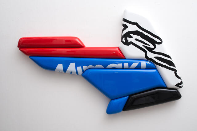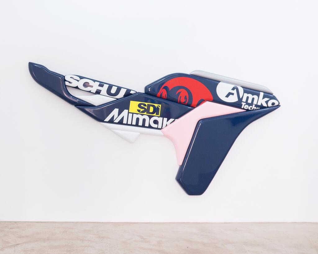 The art of Frédéric Platéus (b. 1976) toys with what is haptical, with the sense of touch, urging the spectator’s desire to lay hands on the pieces immediately. As soft forms and loud colors meet a shiny finish and slick surface, one almost seems to feel the smooth leather underneath the fingertips right away. Explosive typographies, that stem from the artist’s personal nostalgia, trigger a collective memory and bring up memories of the first sport shoe and of a youthful passion for cars, a fascination for motocross and BMX. Since he was a kid, Platéus has had an interest for logos, for catchy letterings and slick designs. Turned into art, the change of form is key. Frédéric Platéus wants to bring art to the wall, but faces a desire to break out of the classical form, to burst the frame. Here, perfection is essential for the Belgian artist, who declares his relationship to art as almost of a fetish-like nature. The final results are modern reliefs, readymades in label-driven aesthetics, highly accurate in form and color.