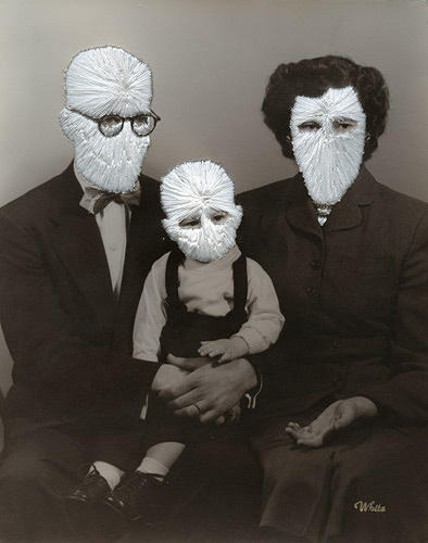 In her new series entitled “Sewn Drawing”, Jessi kept working around the concept of home and it’s residents. This time, she masked people on old family portraits with sewing  to embody the metaphor of the human need to “keep it together” and prevent life from “ripping apart at the seams”. This unusual technique is also a way to reclaim the photograph as a unique and handmade object.