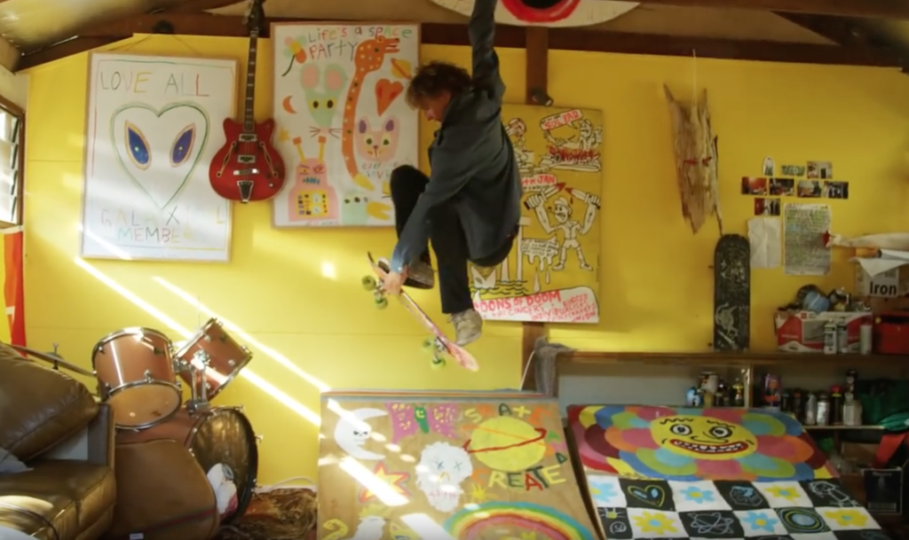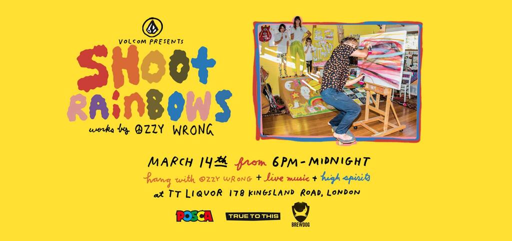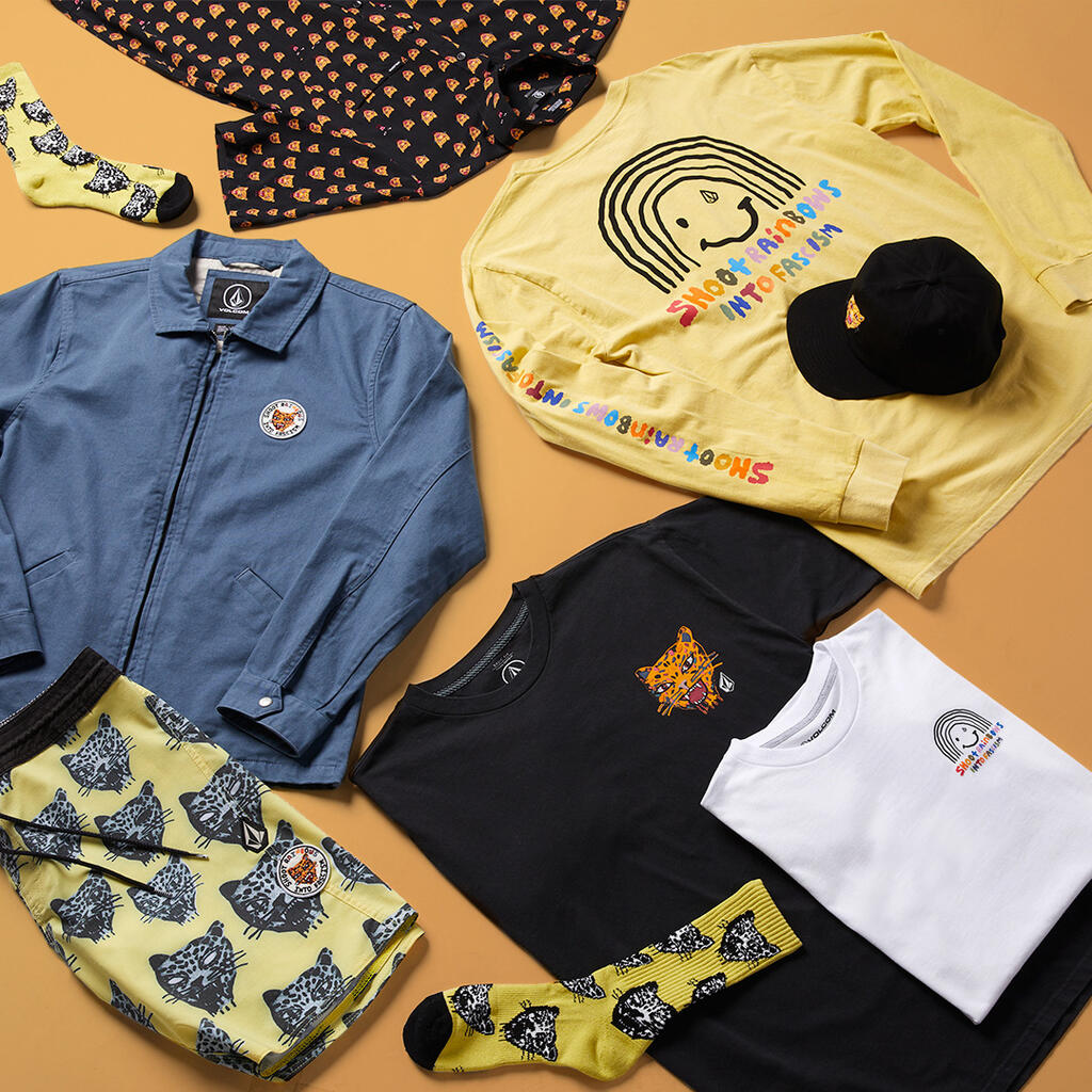 Australian surfer, musician, artist, and all around radical human, Ozzie Wright is making waves with his new coop for Volcom. The anti-fascist statement and artwork has been deconstructed and repurposed, giving the entire capsule a playful punk spin on a meaningful piece of propaganda: Shoot Rainbows Into Fascism!