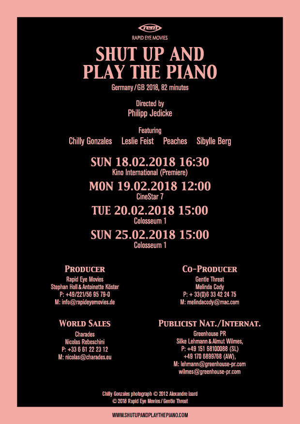 Writer/director Philipp Jedicke with Rapid Eye Movies is premiering his cinematic documentary SHUT UP AND PLAY THE PIANO at the Kino International 18. February. The film tells the story of Chilly Gonzales the Grammy-winning composer, virtuoso pianist and entertainer. Criss-crossing between rap, electro and solo piano music, Chilly became the outrageous pop performer who invited himself to the ivory tower of classical music. The eccentric artist inspires and collaborates with the likes of Feist, Jarvis Cocker, Peaches, Daft Punk and Drake.