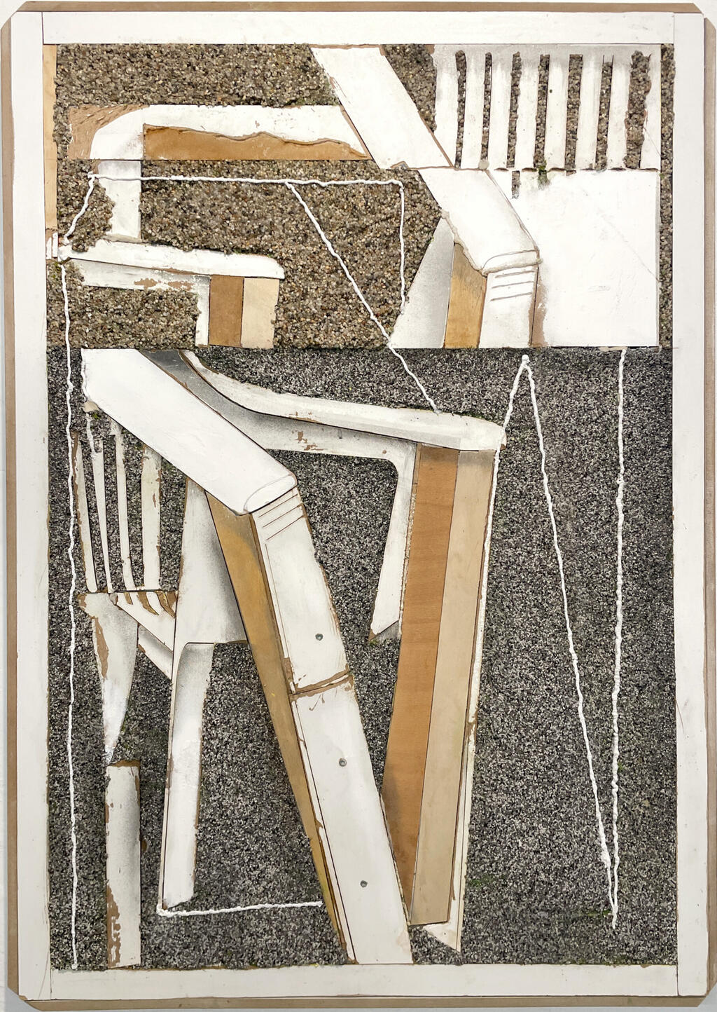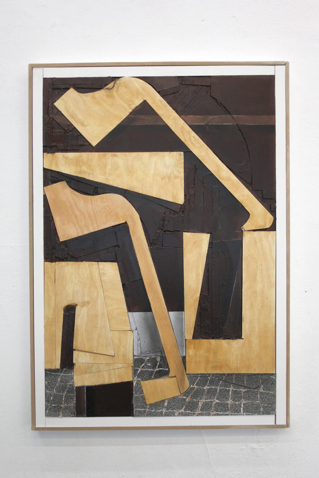 "Sperrmüllbilder" 10.02. – 09.04 2023 - shows a series of new wooden mosaics made especially for the exhibition at Kanya&Kage. These works are not, as the title suggests, made from old wood scraps and other waste, but share de-cluttering that the artist finds in urban space as a common motif. Views of old boards and pieces of furniture are slightly abstracted, but they attempt to reproduce the sculptures created by collaging the visual material in two dimensions, true to the material and to scale.
