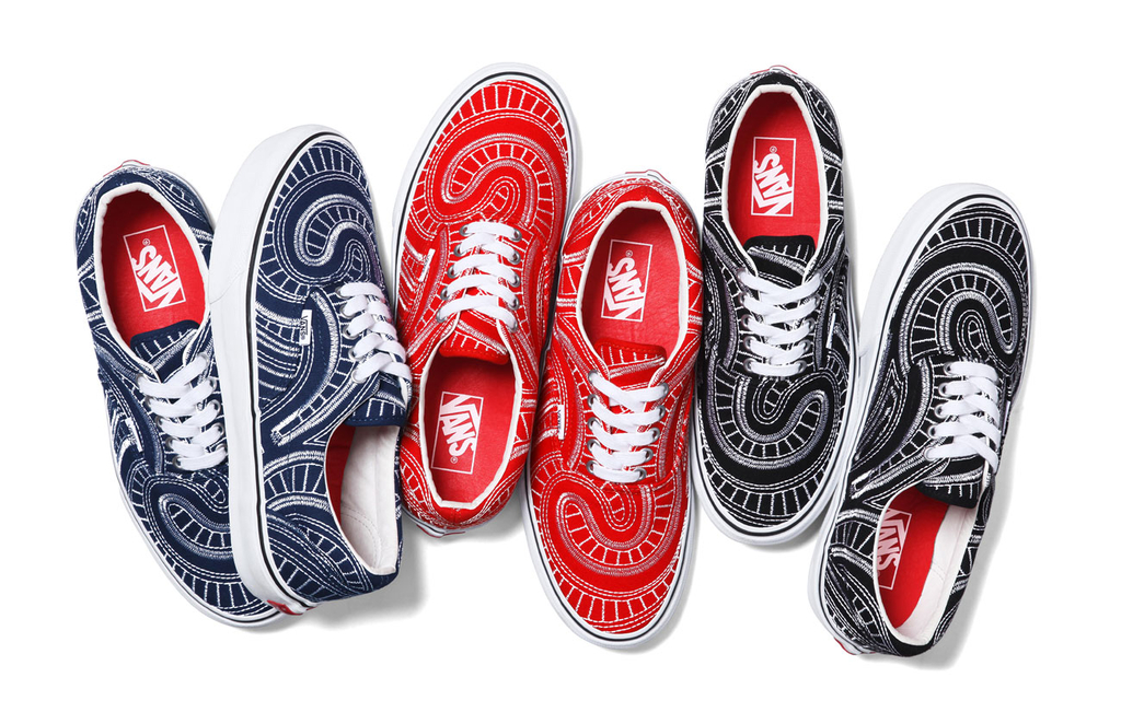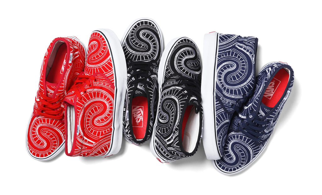 The Spring/Summer ´14 joint venture of Supreme and Vans consists of the classic models Chukka and Era. Both will come in three color ways (red, black and blue) with an abstract spiral pattern made exclusively for Supreme.