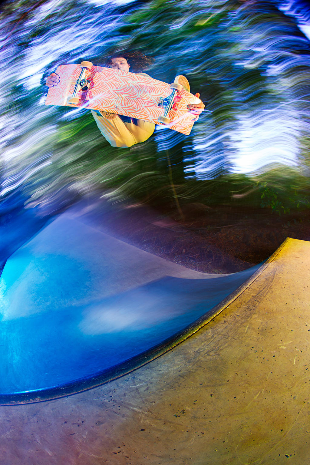 “Here is a picture of good bud Evan Smith shredding my new quarter pipe in the front yard, double grab jammy like the rip grip monster. I had the pleasure of having Evan and Brandon Westgate over for a shreddy day. We were skating the weird boards from my Element 'Wompus" collection. Evan is one of my favorite ever wildbeasts in skateboarding. What a fuckin freak, pure creation every moment. There will be a video dropping next week I think about the process of the collection and shreddy weirdnesses. This pic was taken by Brian Gaberman who is an amazing photographer. Brian was one of my young fledgling photographers when I was a photo editor at skateboarder magazine. Back then he was inspired by my wild color gel, long exposure approach to skate photography. So, when we did this shoot, he tried to emulate that old style. And of course he did it better than I ever did, because he is the man. I am constantly inspired by Brian.”