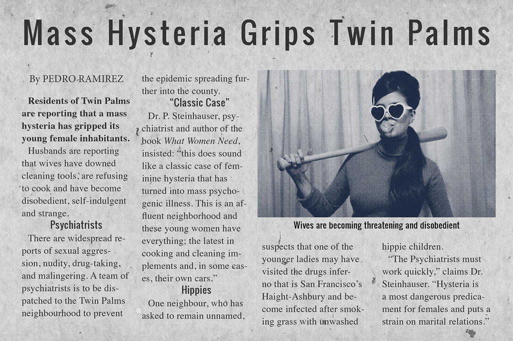 “Gender relations were evolving in this period, though you’d find few dominant, self-aware female characters of this sort represented in the male- dominated movie and television industries. It became interesting to me to transplant a more modern psyche back into this mid-century environment; to represent a spirit perhaps present but not yet fully realised. Gender relations and the notion of gender itself are sources of conflict that are a long way from resolved. It’s a positive thought to consider that the concept of gender will evolve to the point that one day we might look back in mockery in just the same way.”