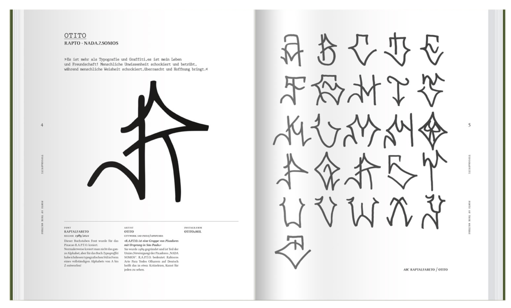 The book presents all the writers and their typefaces in detail, and includes accompanying statements as well as photographs of the fonts in use on the wall. Thus, the publication is intended as an inspiration for sprayers, type designers, graphic artists and art enthusiasts.