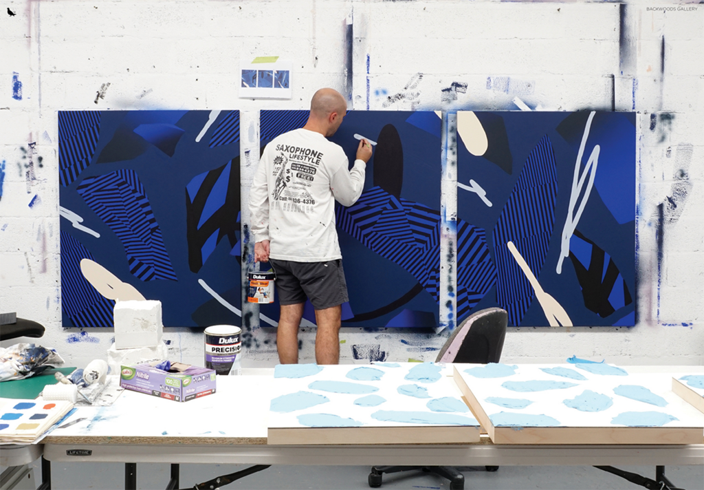 The main goal when I'm designing and sketching these works is balance. It's a pretty lengthy process… there's a stroke up the top that reacts to the shape below so then that means further down the canvas I need to add something else to balance it out… Colour is a major part of the pieces… it’s not just the balance of shape versus mark making versus form, but also how different colours sit next to each other and the colours in between. I'm a pupil of colour.