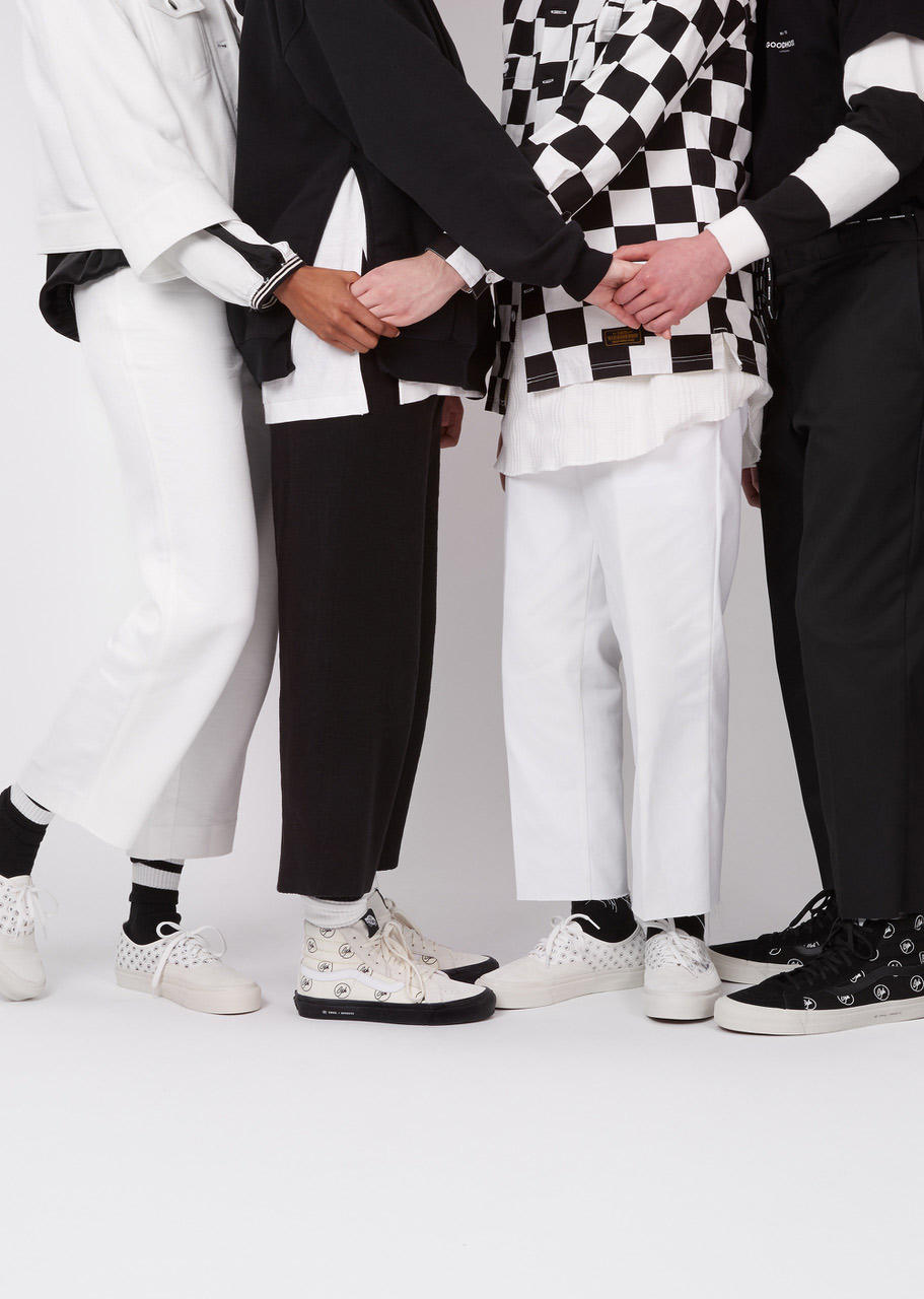 Inspired by Newton’s law of physics which states that ‘for every action there is an equal and opposite reaction’, with forces on an object being consistently identical, the pack comprises three shoes where both women and men are equally represented. The collaboration features a white and black Sk8-hi that runs in a female size break, with the inverse colours appearing on a second Sk8-hi in men’s sizing. The trio is completed by a white and black authentic available in a full unisex size range.