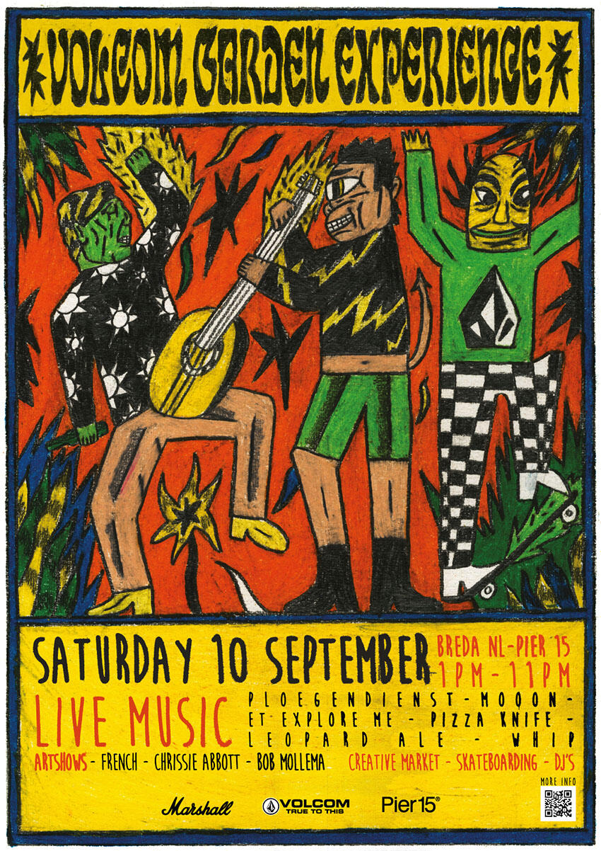 The event will feature live bands, art exhibitions gathering some artists revolving around the Volcom universe, but also a creative market, skateboarding challenges with prizes, food and drinks. Celebrating their upcoming Volcom Featured Artist collection the art exhibition will showcase works by Chrissie Abbott, French and Bob Mollema!
